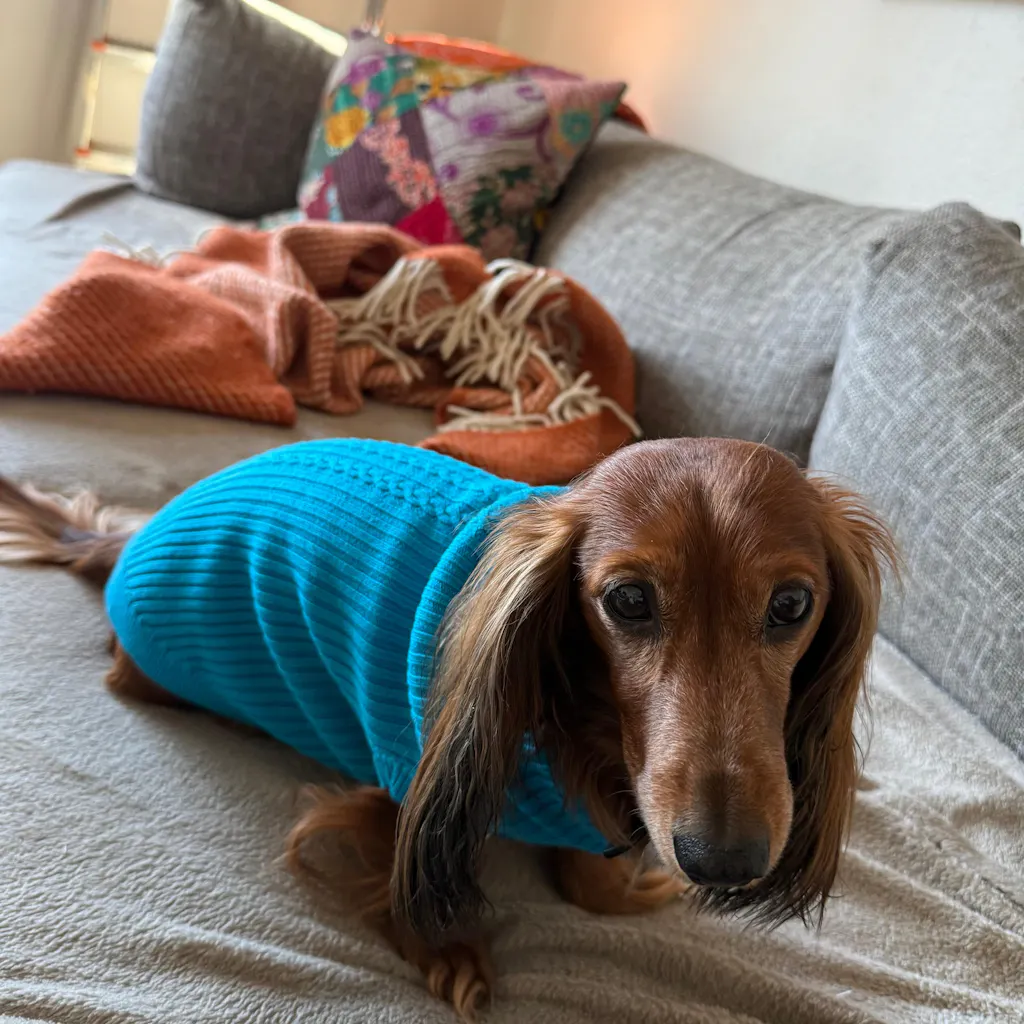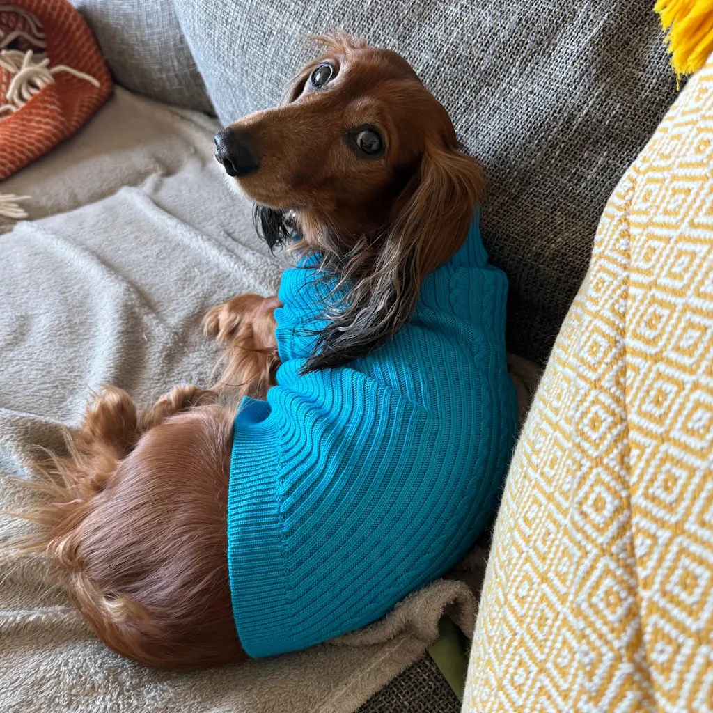 100% Mongolian pure wool dog jumper in vibrant blue.